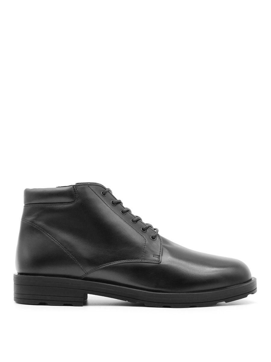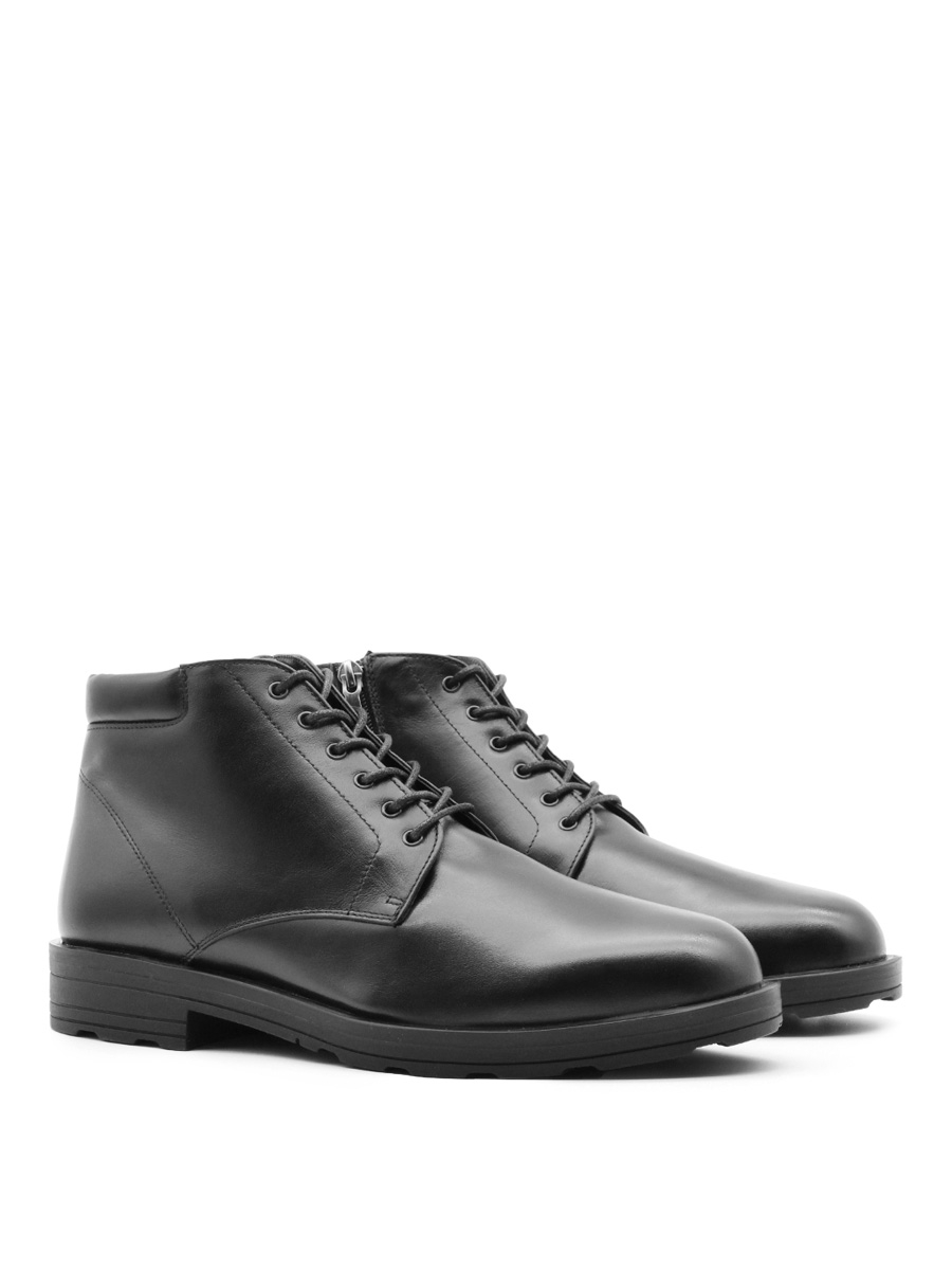 Ботинки на шнуровке — самая функциональная демисезонная модель обуви. Она легко подстраивается под образы в разных стилях и остается практичной. Изделие выполнено из гладкой натуральной кожи в универсальном черном цвете. Пара дополнена подошвой с выраженным протектором, который предотвращает скольжение, и шнуровкой, надежно фиксирующей ботинки.