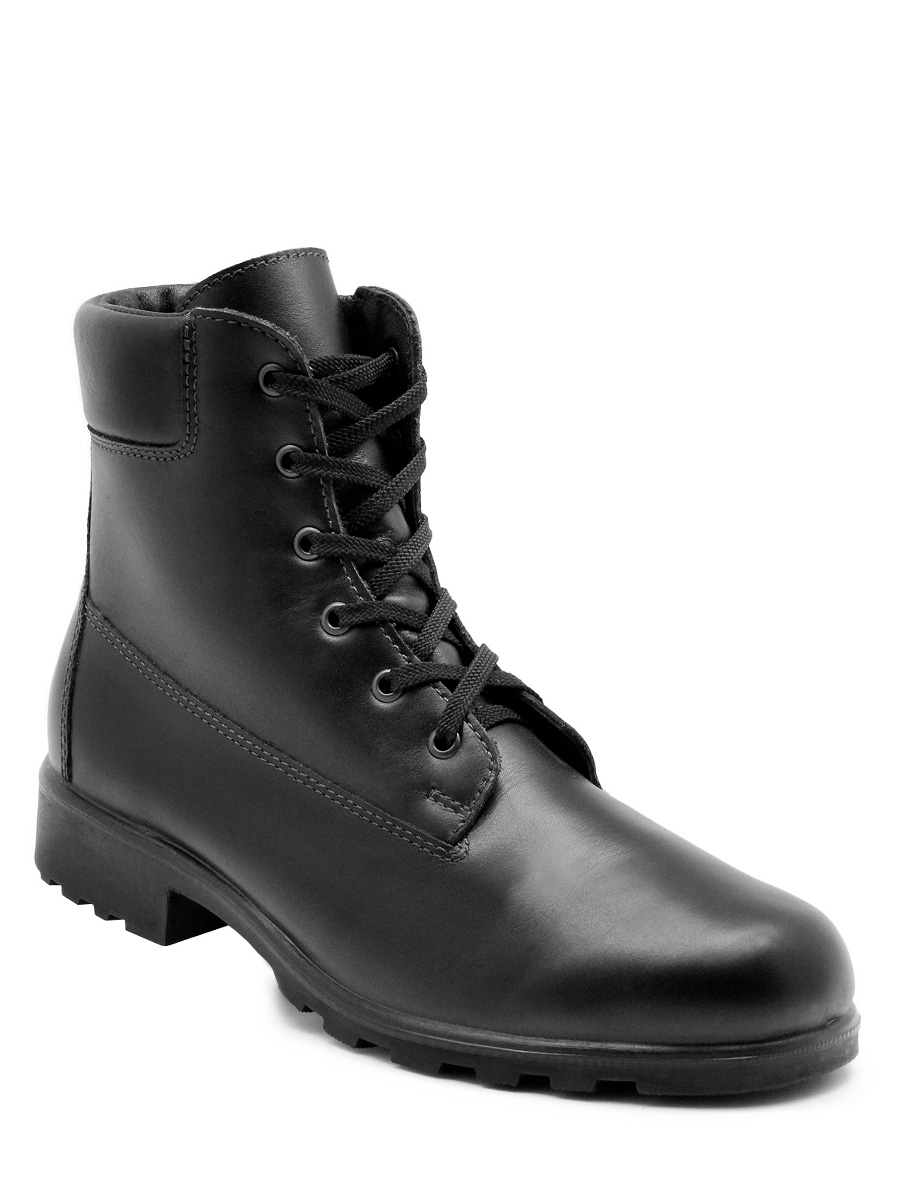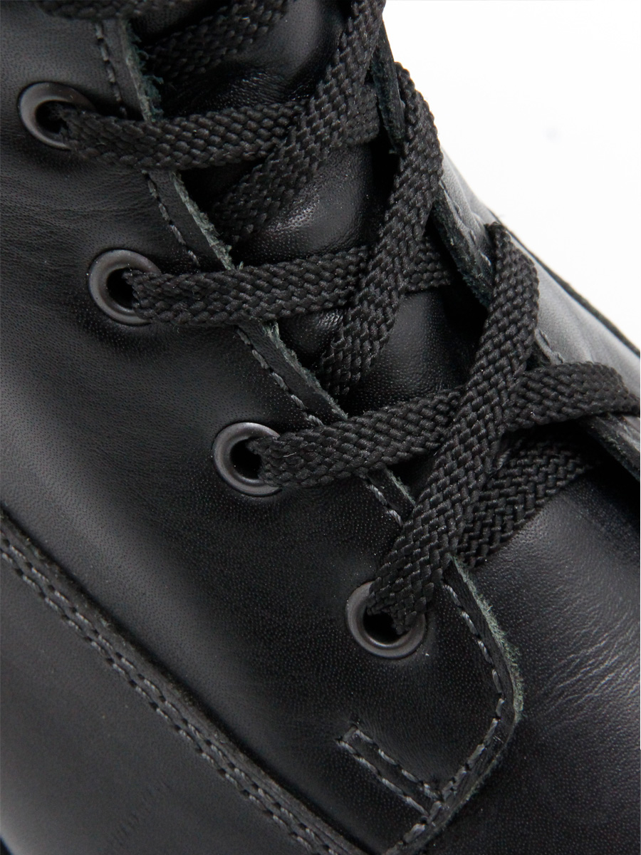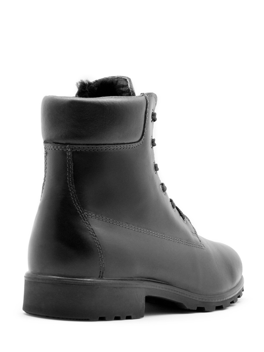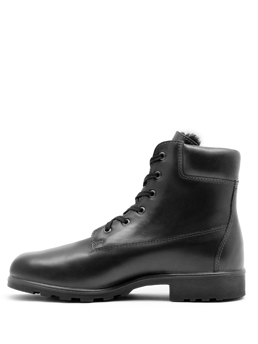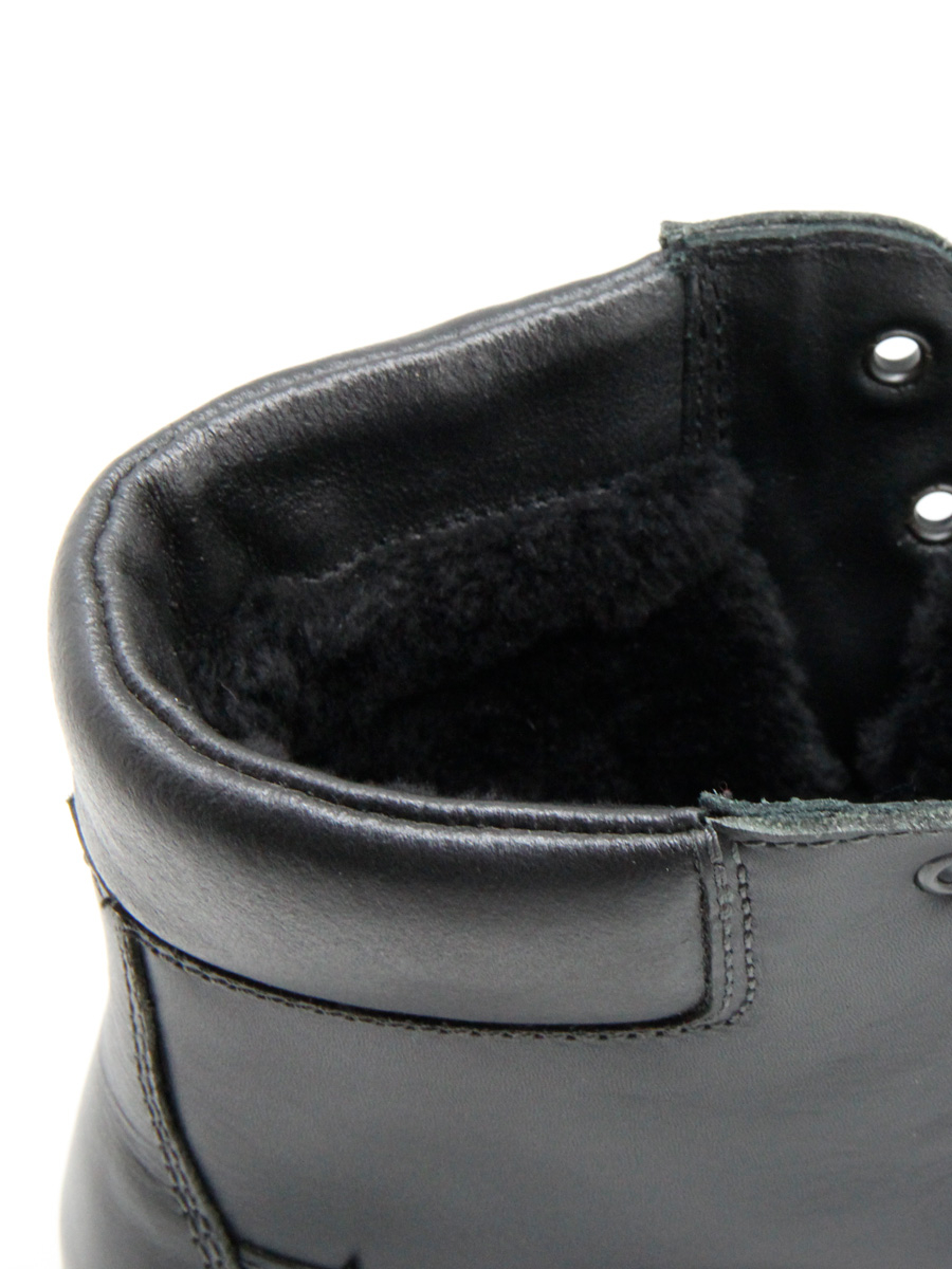 Модель выполнена из гладкой натуральной кожи черного цвета, дополнена комфортным натуральным мехом. Лаконичный дизайн с высокой шнуровкой и устойчивым каблуком делает пару универсальным игроком в любом гардеробе. Ботинки легко впишутся в форменные образы.