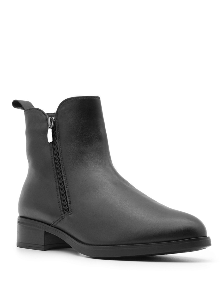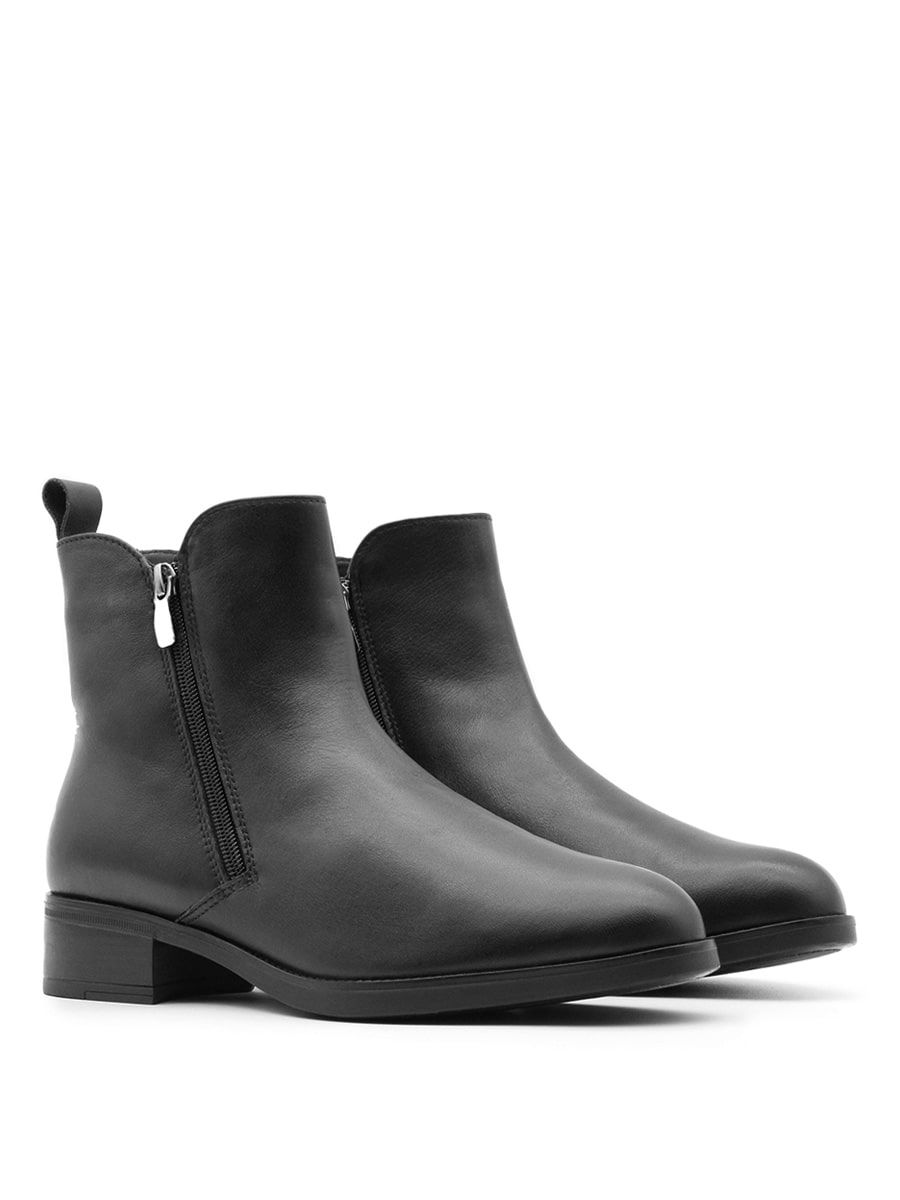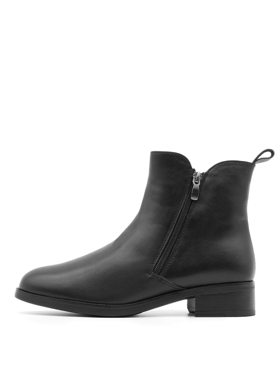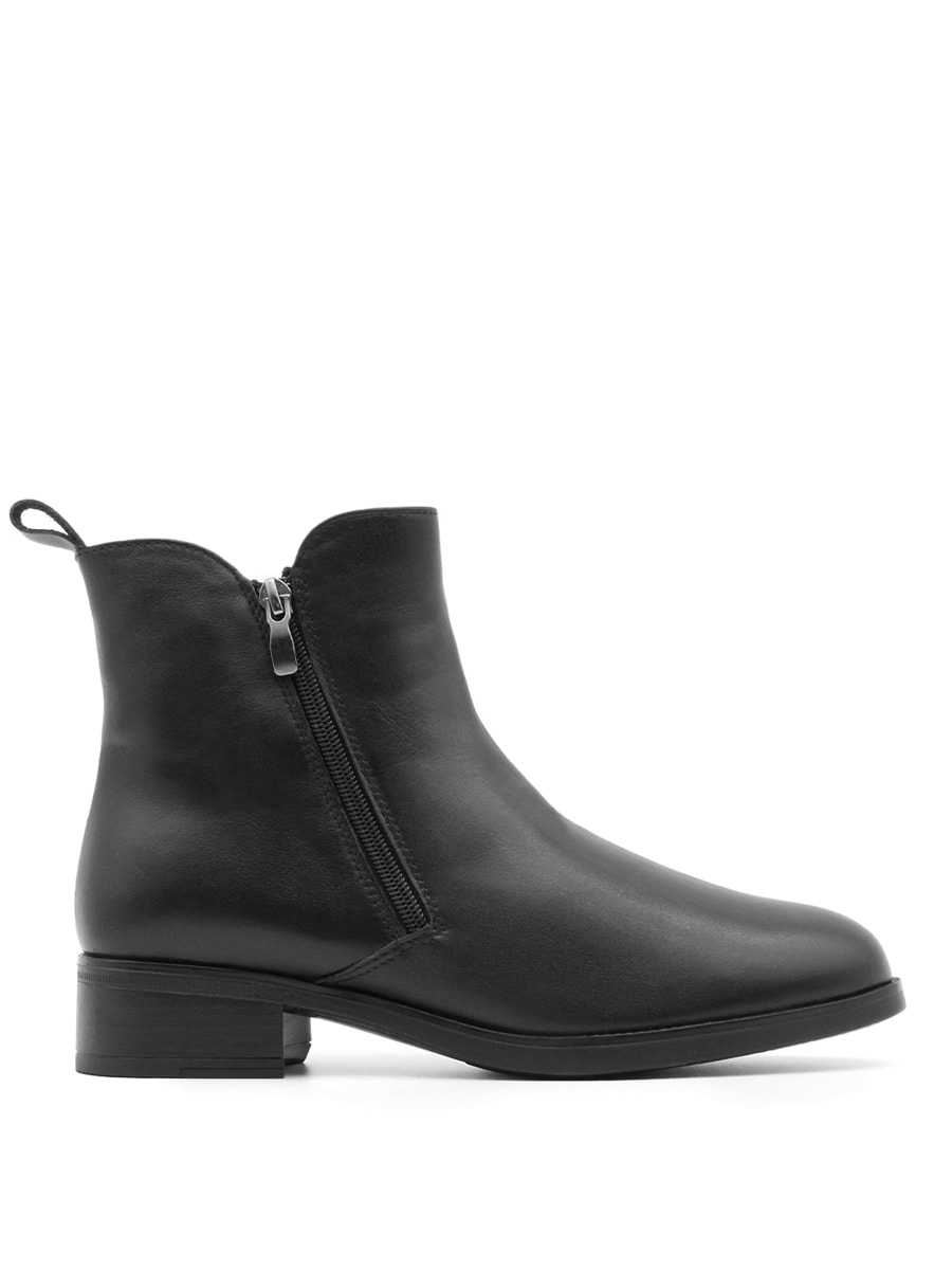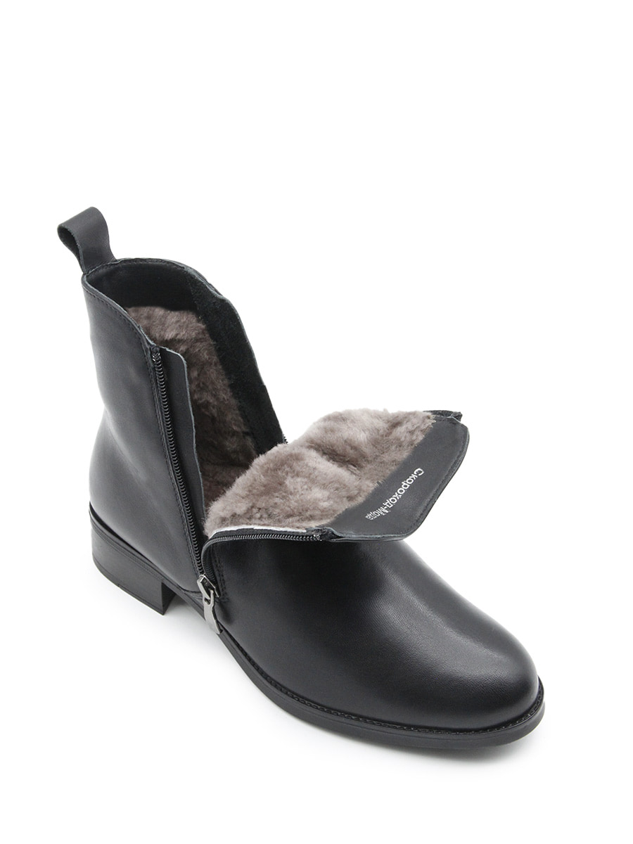 Идеальная пара для элегантной повседневности. Зимние ботинки выполнены из натуральной гладкой кожи черного цвета и дополнены подкладкой из мягкого натурального меха. Боковые молнии надежно фиксируют модель на стопе и позволяют легко снимать и надевать обувь.Лаконичные ботинки на нескользящей подошве легко впишутся в любой гардероб и станут дополнением деловых и повседневных сочетаний.
