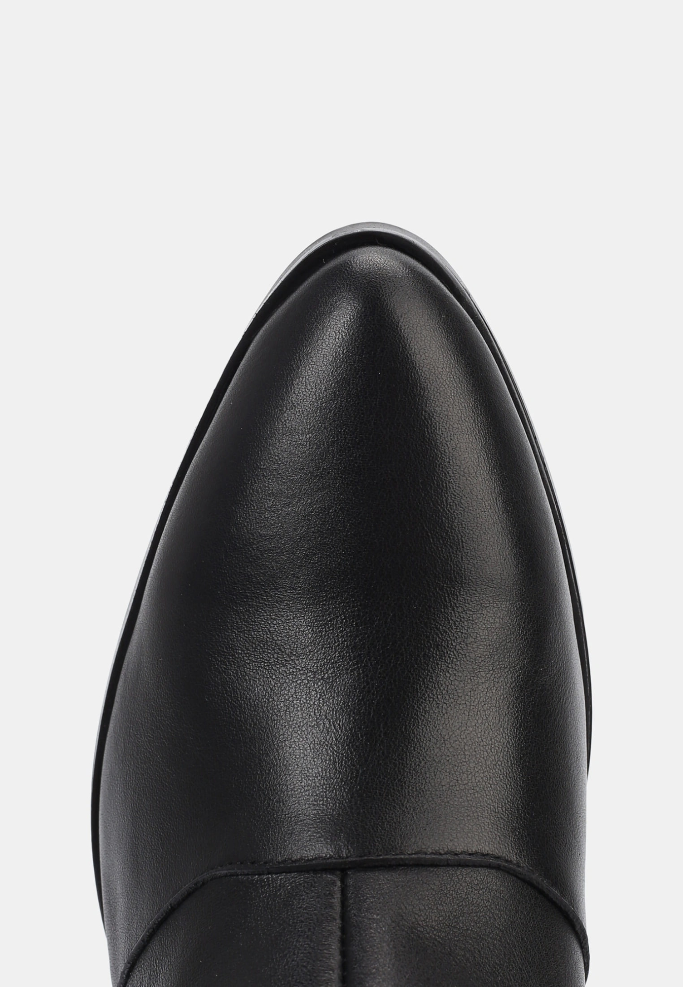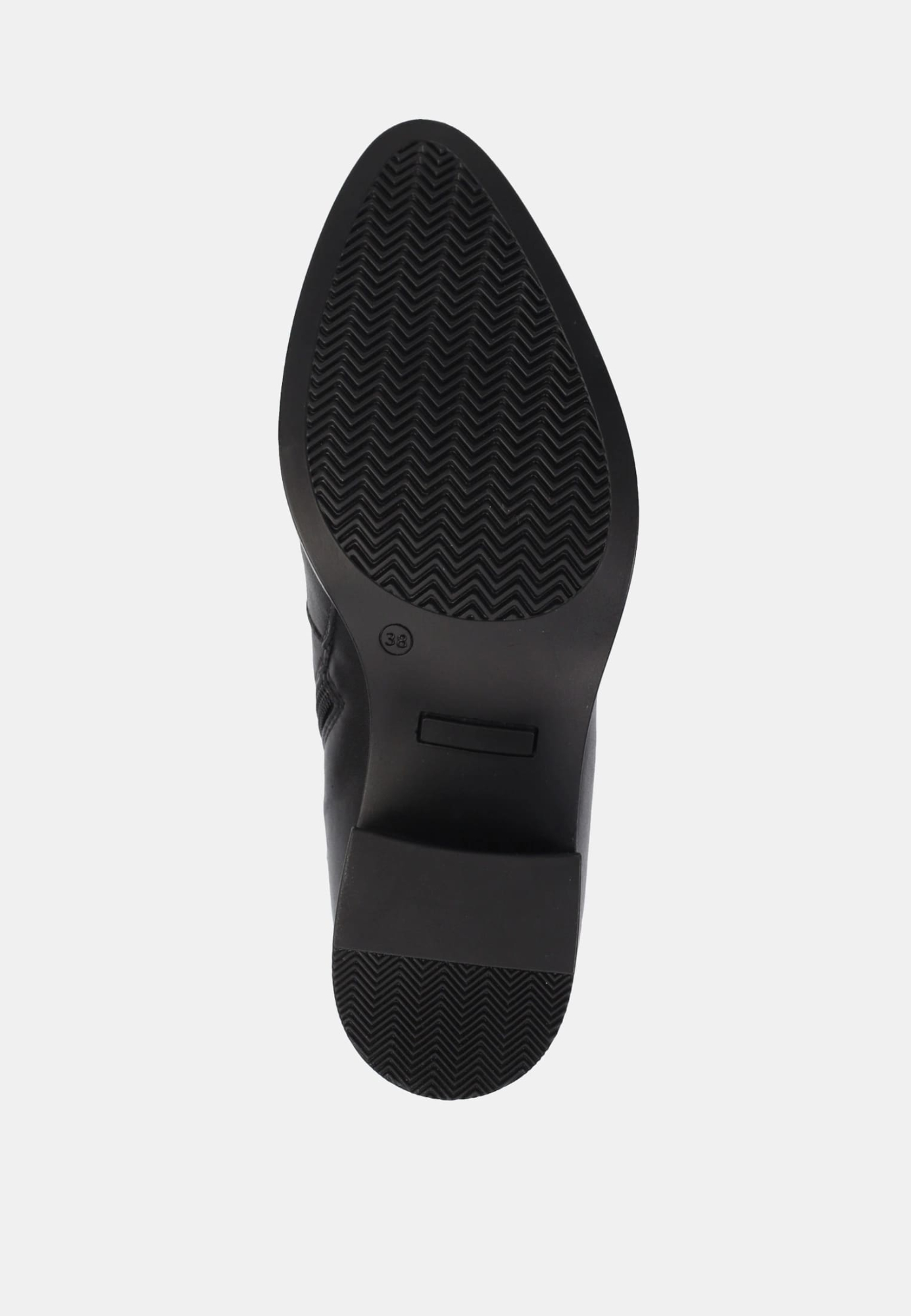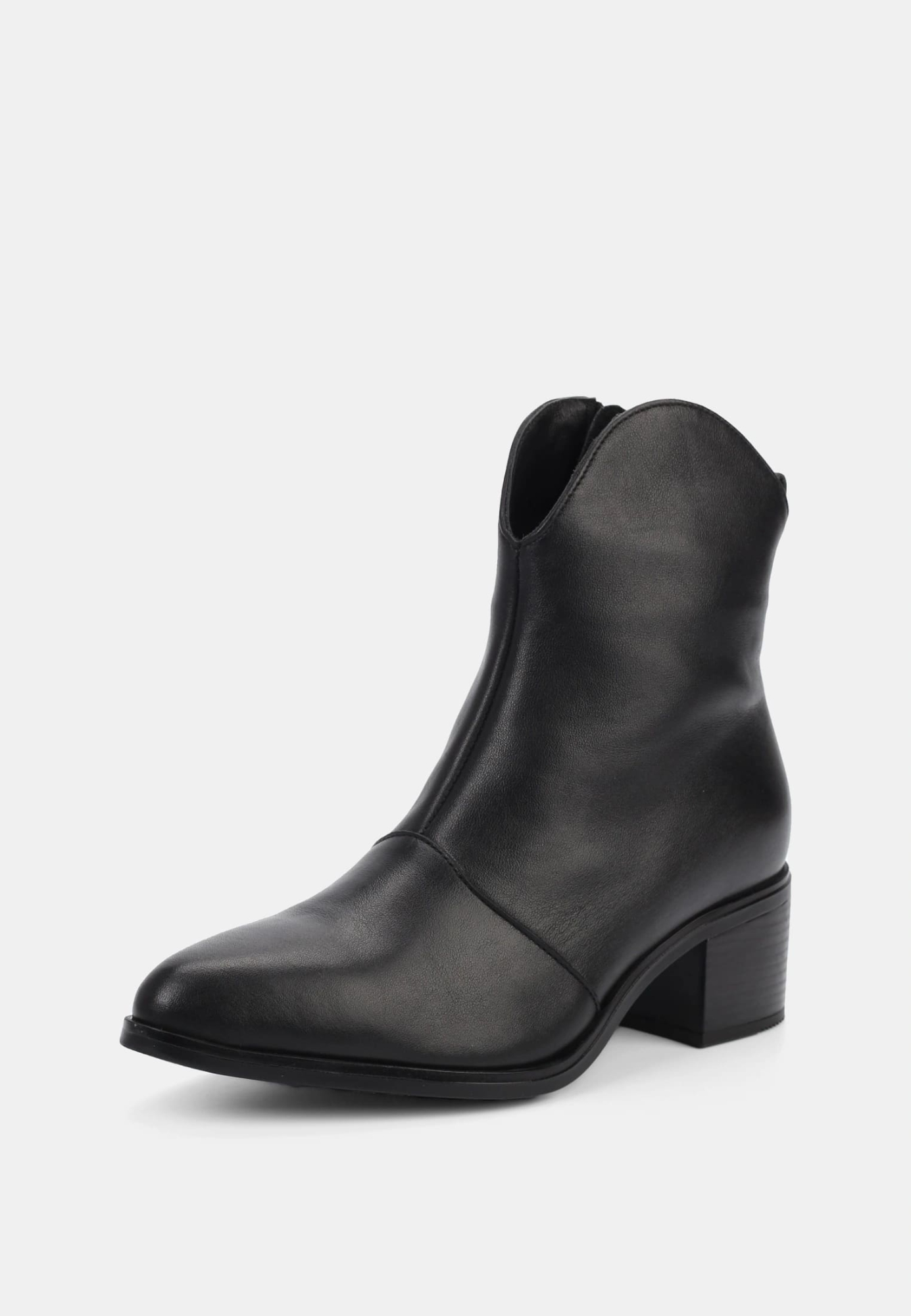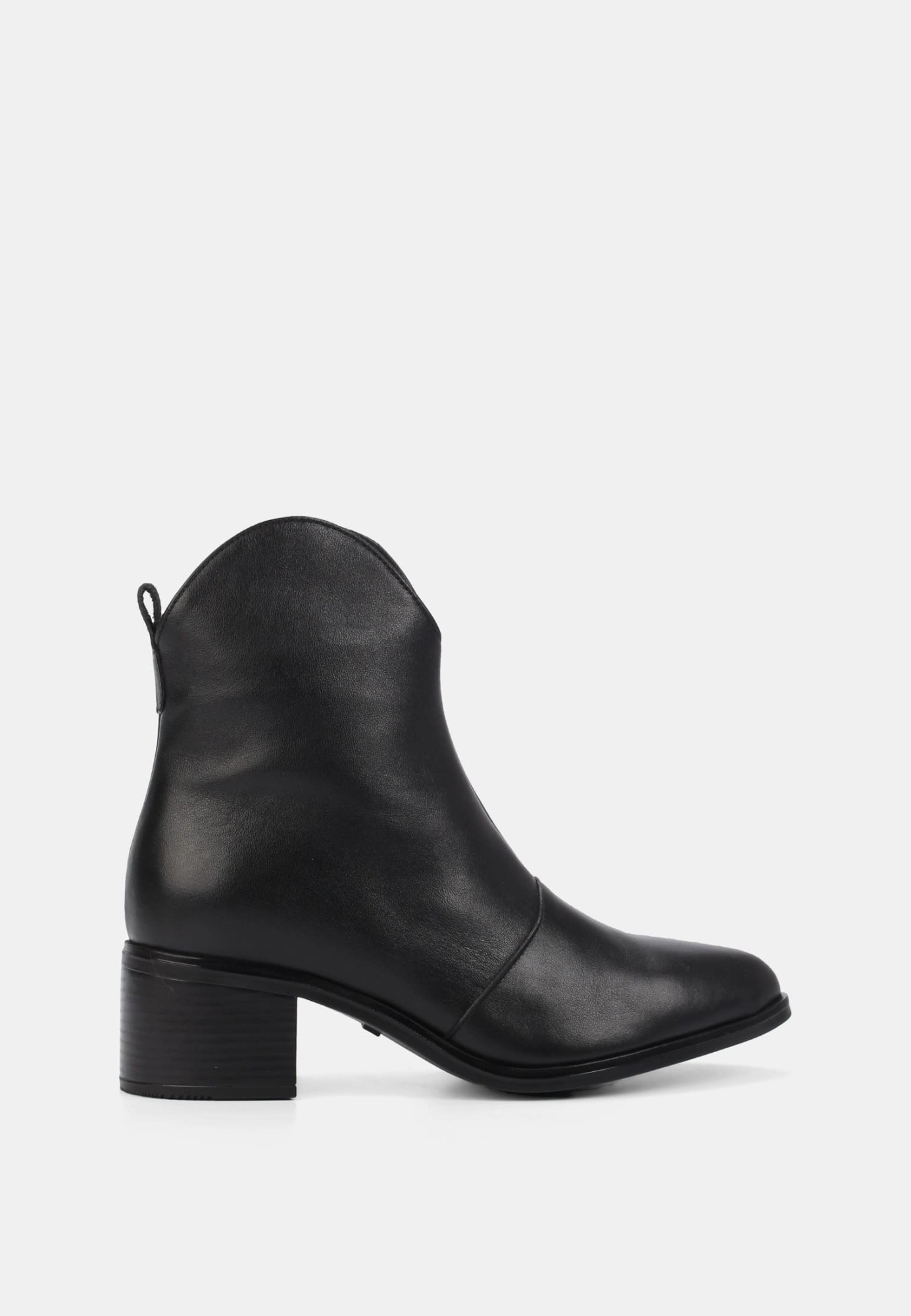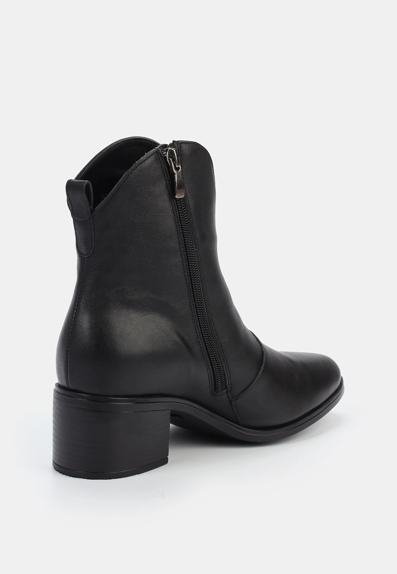 Стильные черные ботильоны из гладкой натуральной кожи, в которых классика встречается с современным характером. Элегантный зауженный носок визуально удлиняет ногу, а фигурный вырез по верхнему краю добавляет женственности и динамики силуэту. Устойчивый каблук средней высоты и мягкая посадка обеспечивают комфорт при активном ритме дня. Боковая молния делает обувь практичной и удобной, а лаконичный дизайн позволяет сочетать ботильоны как с платьями и юбками, так и с джинсами или брюками. Это универсальная пара, которая придает образу уверенность и утонченность.
