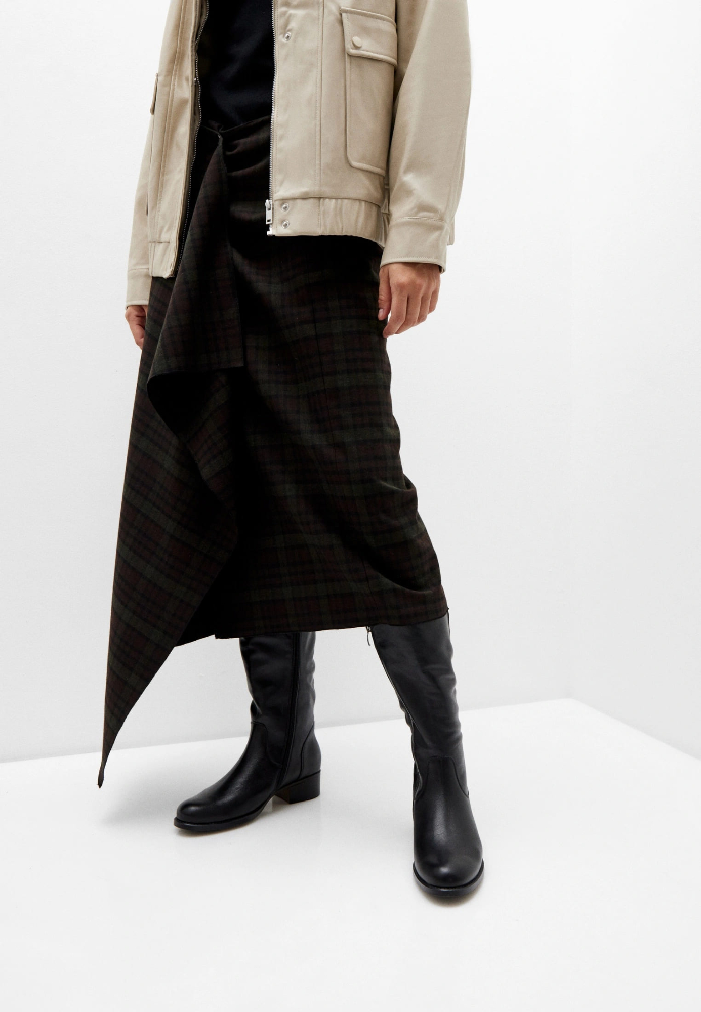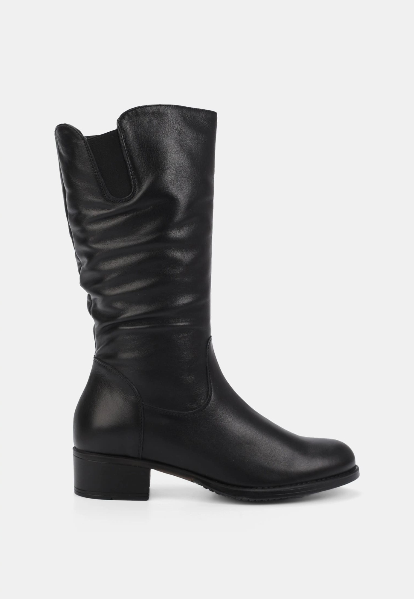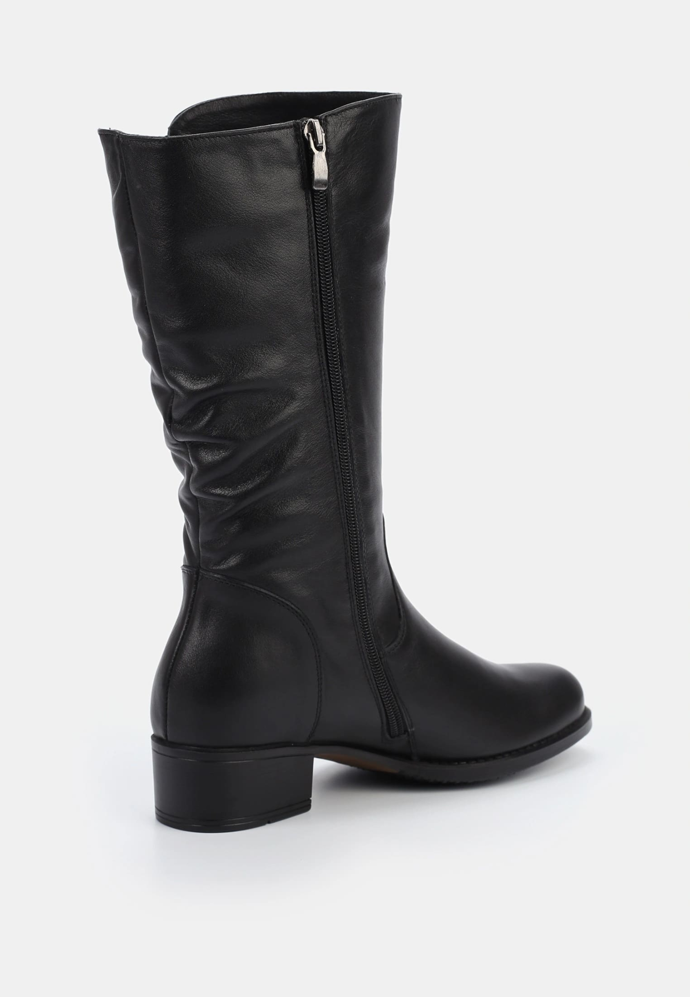 Элегантные черные сапоги из мягкой натуральной кожи, сочетающие изысканный дизайн и функциональность. Утончённый силуэт с лёгкой драпировкой придаёт образу женственность и утонченность, а удобный невысокий каблук обеспечивает стабильность и комфорт при движении. Боковая молния облегчает надевание, а плотная посадка по ноге подчеркивает её стройность. Эти сапоги — универсальное решение для холодного сезона: они гармонично дополнят как деловой наряд, так и повседневный образ, добавив в него нотку уверенности и классической элегантности.